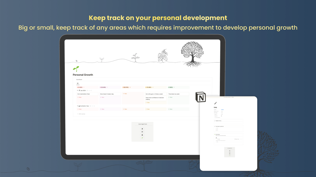 Besides journaling and mood tracking, keep track on their personal development. Every journal entry created shows a database to input something you could improve on.