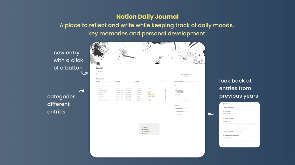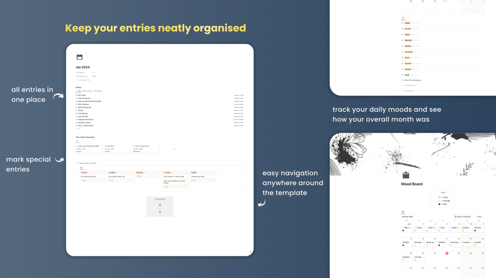 Start journaling with pre-made templates consisting of simple prompts and categorise entries into different areas of life and sections, as well as to each month/year. The Notion Daily Journal was made to keep all entries neatly organised and categorised to your preferences.